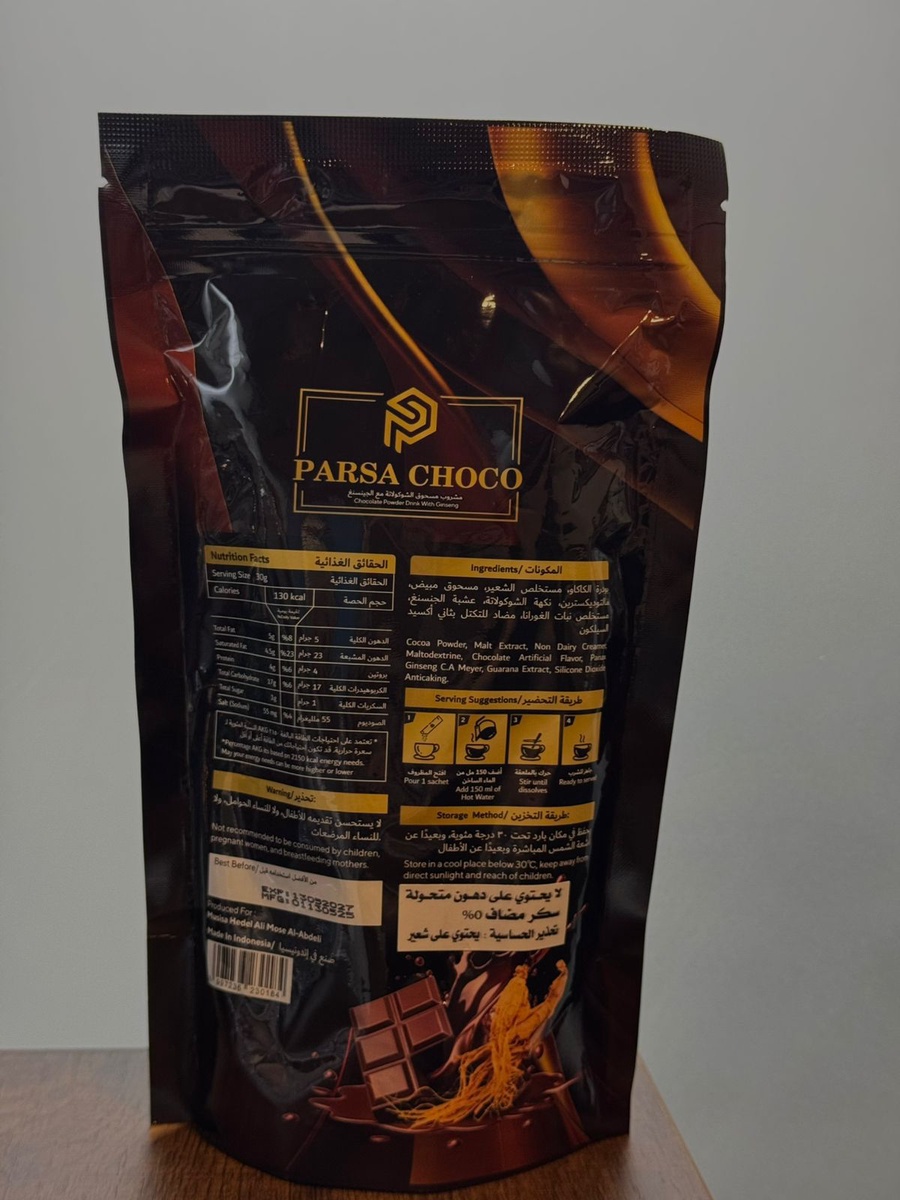 كل ظرف يحتوي على 30 جرام من مسحوق الشوكولاتة والجنسنج.